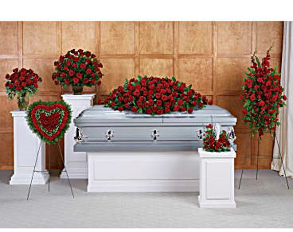 This radiant red rose collection includes six hand-arranged sympathy pieces, an elegant tribute to your greatest love. Teleflora's Greatest Love Collection includes the following six sympathy set pieces: Greatest Love Casket Spray, Deep In Our Hearts Spray, Majestic Heart, Rose Tribute Bouquet DX, Forever Our Angel DX and Forever Beloved DX